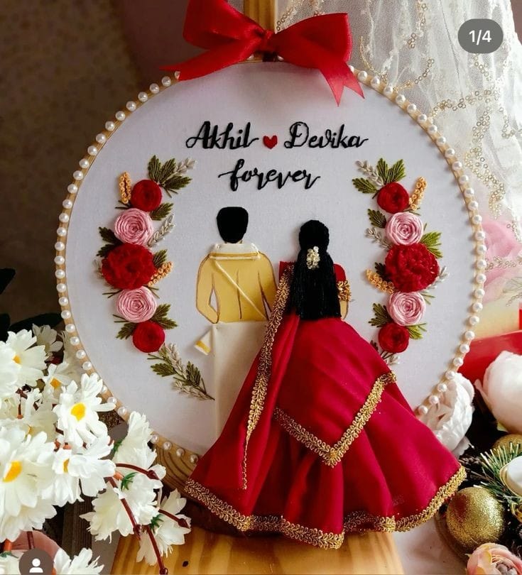 Each hoop is meticulously stitched with fine details, featuring a couple dressed in traditional attire. The design can be personalized with your names and a loving message, making it a truly one-of-a-kind gift. The elegant floral and pearl accents add a touch of sophistication and romance to this beautiful piece.