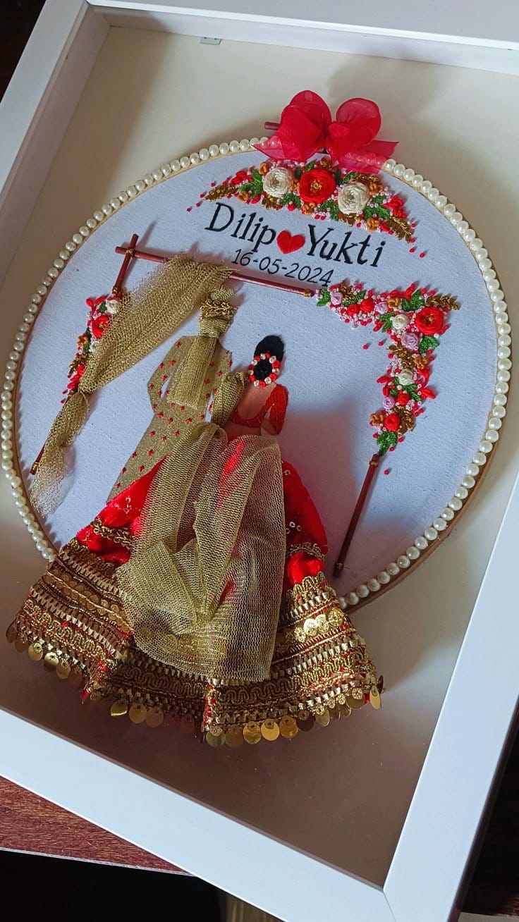 Each hoop is meticulously stitched with intricate details, featuring a beautifully dressed couple in wedding attire. The design is fully personalized with the couple’s names and their special date, making it a truly one-of-a-kind gift. The elegant floral accents and decorative pearls add a touch of romance to this beautiful art piece, all presented in a lovely white frame.