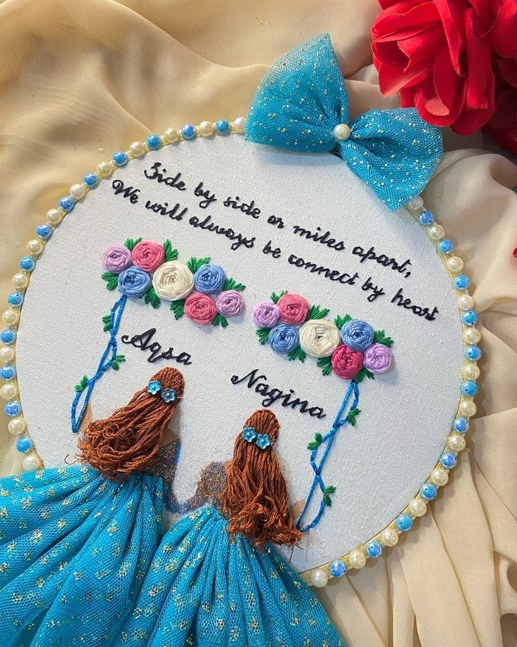 A beautiful, hand-embroidered hoop featuring two friends with custom names and a heartfelt message. The perfect personalized gift to celebrate a special bond.